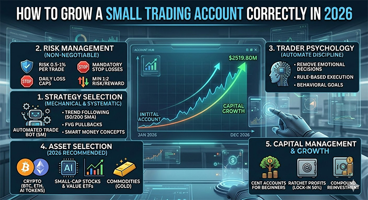 Growing a small trading account in 2026 requires discipline, risk control, and a simple strategy. Most traders lose money because they risk too much